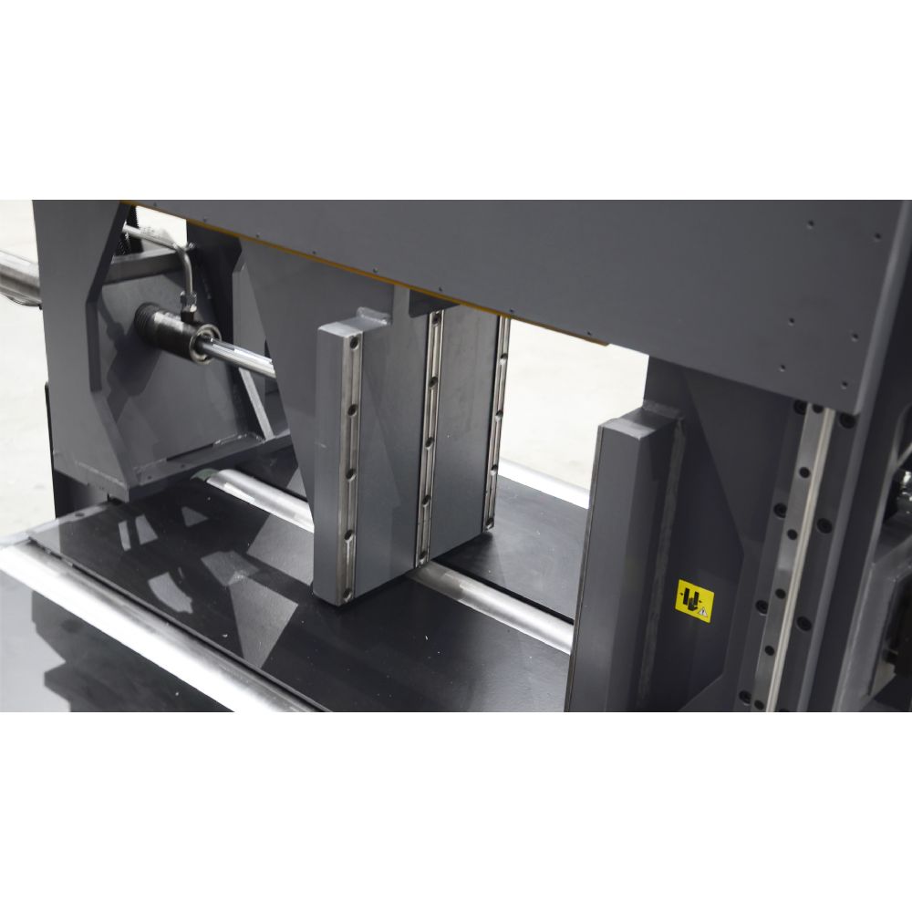 Úpínání materiálu zajišťují plnozdvihové svěráky. Stroj je vybaven frekvenčním měničem, který umožňuje plynule nastavit optimální rychlosti pilového pásu vůči řezanému materiálu v rozsa- hu od 15 do 90 m/min., což výrazně zvyšuje jak životnost pilových pásů tak i produktivitu stroje.