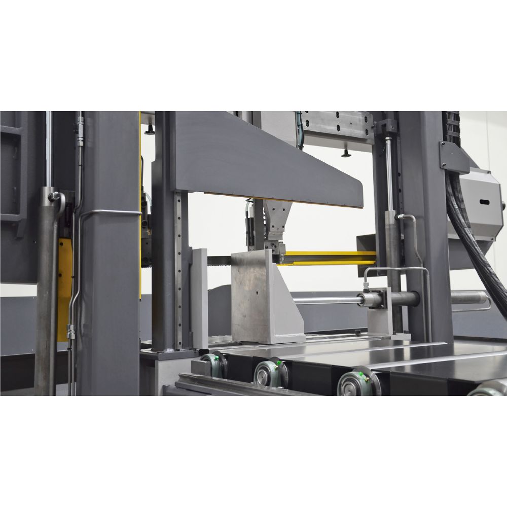 Automatická pásová pila dvousloupové konstrukce navržená pro kolmé řezy jak plného, tak i pro lového materiálu.