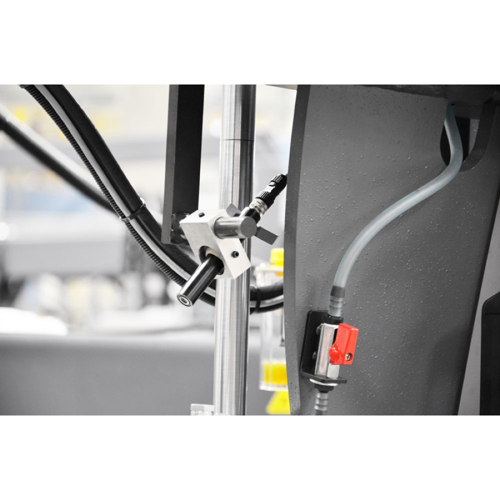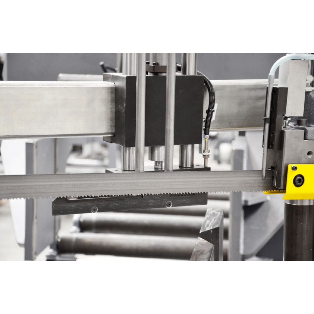 Ke standardnímu vybavení stroje patří automatická regulace přítlaku pilového pásu do řezu v závislosti na odporu řezaného materiálu a plynule nastavitelný posuv ramene pily do řezu.