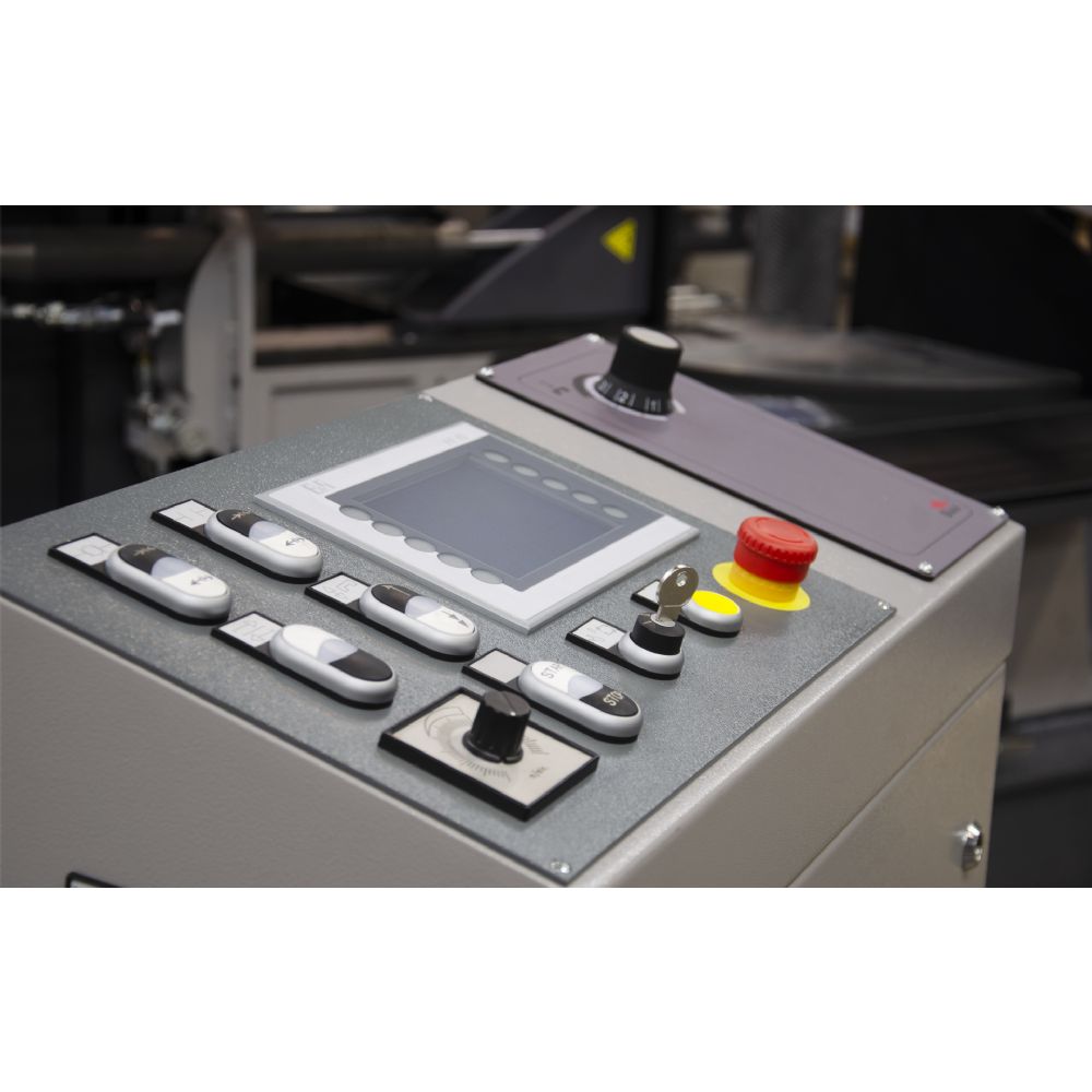 Veškeré ovládací prvky jsou umístěny na volně polohovatelném ovládacím panelu. Rozsah natáčení ramene pily je plynulý od 0° do 60° vpravo při stálé poloze upnutého materiálu. Upínání materiálu zajišťují plnozdvihové svěráky.