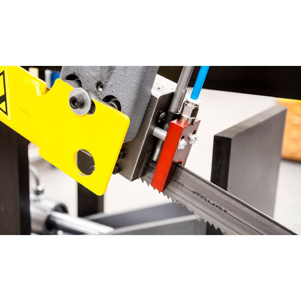Pro plynulé řezání trubek a profilů, nanáší mikro-ostřikovací jednotka mazací film na hroty zubů a boční strany pilových pásů.Micro-spray-systémPro plynulé řezání trubek a profilů, nanáší mikro-ostřikovací jednotka mazací film na hroty zubů a boční strany pilových pásů.
